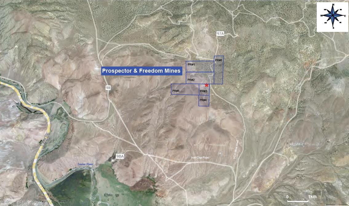 The Prospector and Freedom Mines Project consists of 6 contiguous claims covering 39.5 Ha in Piute County, Utah. The property is located adjacent to the Fishlake National Forest, approximately 5.25 km northeast of the village of Marysvale. A network of gravel roads allow easy year-round access to the property.