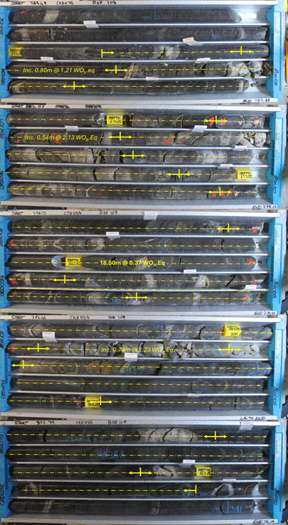 • 0.80m @ 1.02% WO3, 0.09% Sn & 0.45% Cu (1.21% WO3.Eq) from 372.50 m