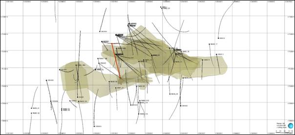 Figure 2: Plan (top-down) view of the previously modelled high-grade domains (gold) used in the 2019 Redmoor MRE, showing CRD036 (in red) and other CRL and SWM drillhole traces (black). CRD036 is an infill hole aimed at testing short-spaced continuity of structure and grade.