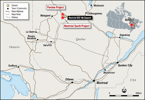 The Project is located approximately 500 km northwest of Montréal in Québec, around 100 km from the service town of Lebel-sur-Quévillon, approximately 50 km west of the Waswanipi Cree First Nation community, and benefits from easy access via established logging roads (Figure 1)2. The Project comprises 43 mineral claims, covering approximately 2,400 ha area and is located 7km from the world class Montviel Deposit, which has a total Indicated and Inferred resource of 266 Mt @ 1.46% TREO and 0.14% Nb2O5.