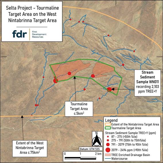 Figure 2: Extent of the Tourmaline target area and enriched streams on the West Nintabrinna target area.
